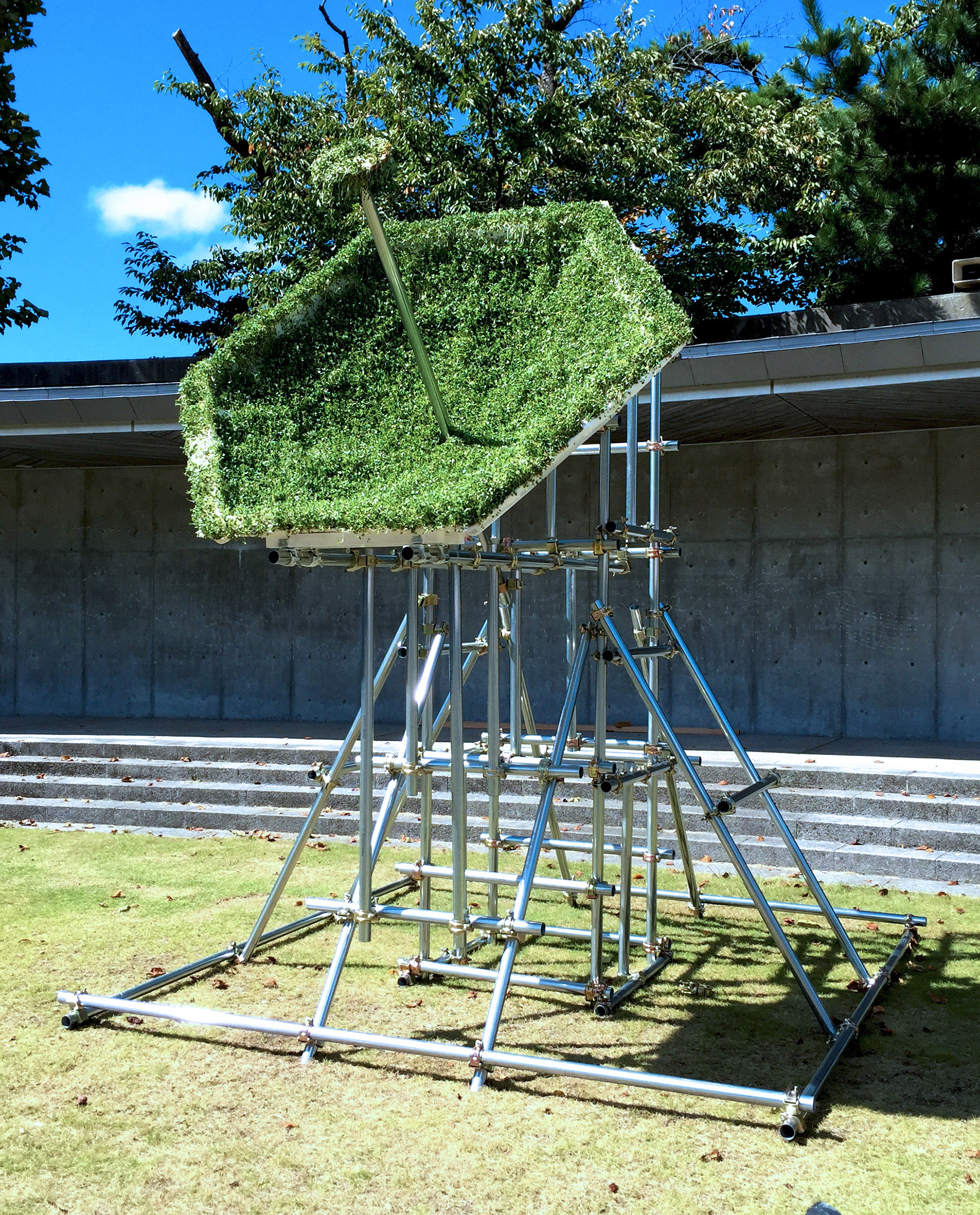 パラボラアンテナ状に組んだ木材に脱脂綿を貼り、かいわれ大根を植えた彫刻作品。太陽のエネルギーを植物が受信するイメージで制作をした。